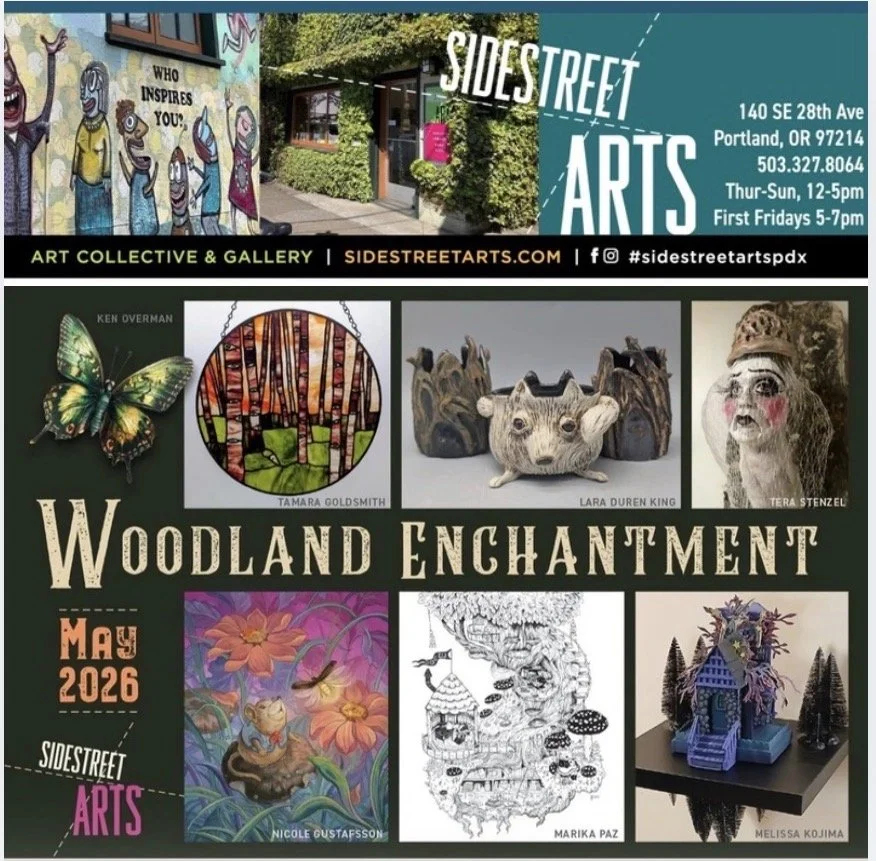 Amelia Opie- Sidestreet member, Amelia Opie, hails from a family filled with artists and has a solid lifelong background in painting. She has recently started to translate her painted fantastical beasts into the three dimensions of ceramics. Amelia loves the ease of use and level of detail she can achieve with acrylics, and has maintained the vibrancy of her color palette in clay. She finds universal appeal in animals as subjects, and loves to paint them in their home environments, often busily engaging in various activities or play. More of her work can also be found on Instagram, @threepawprints or on her website www.ameliaopie.com